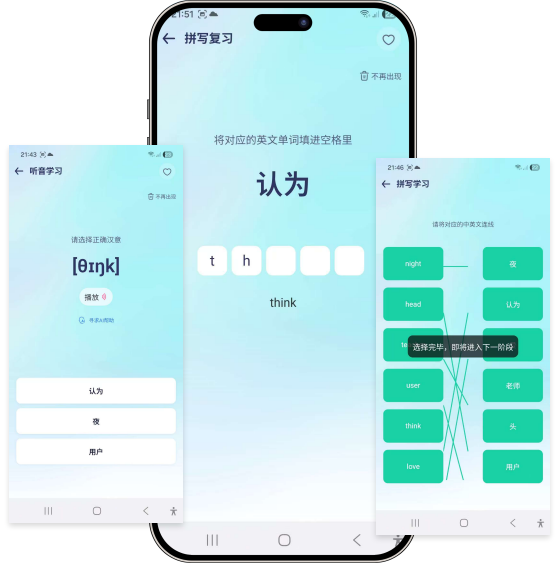 视频、短句、填空会随着用户历史学习自动变化,减少重复感,提高积极性。